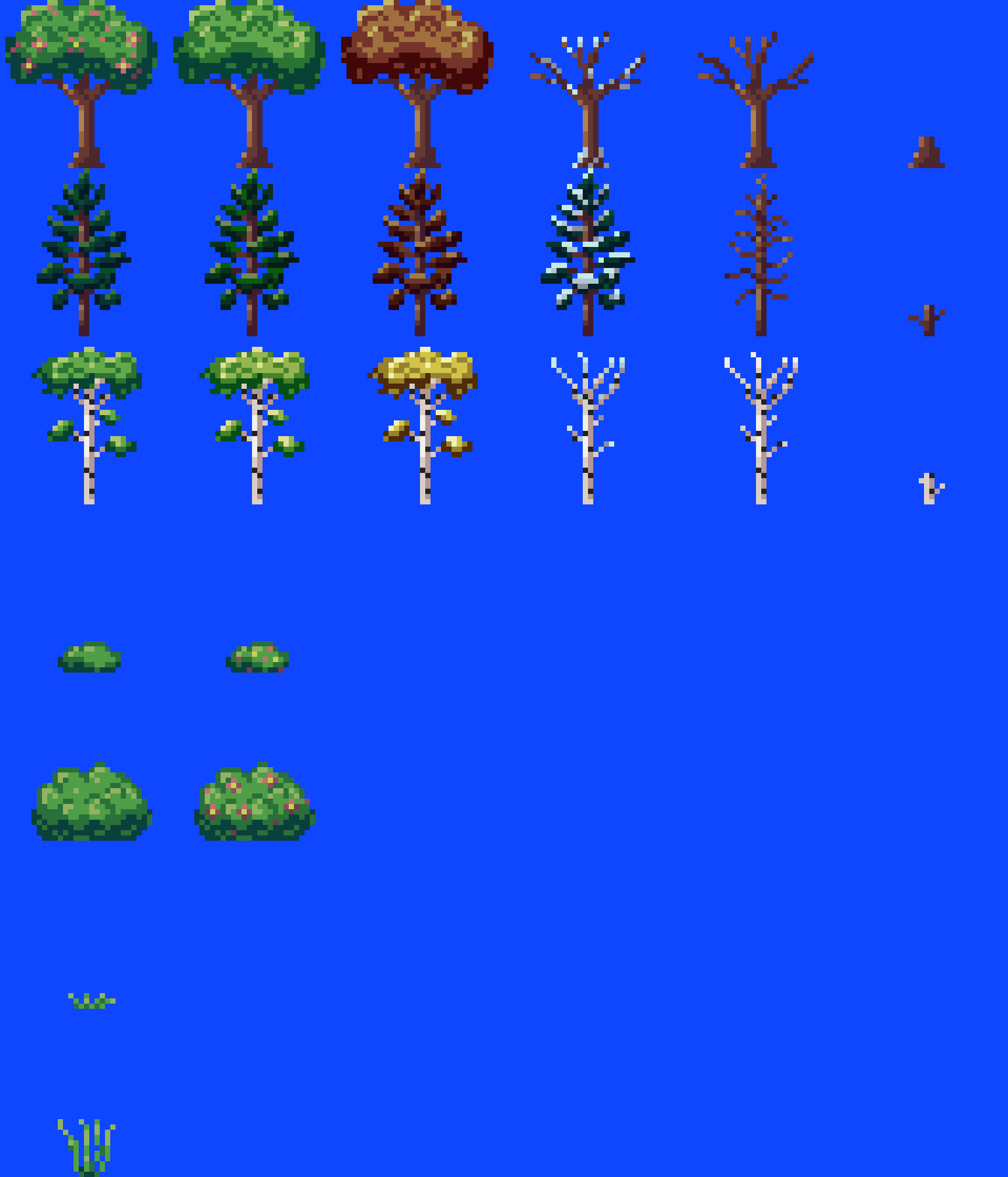 - 3 trees, with 6 variations each: spring, summer, autumn, winter, dead, and cut down